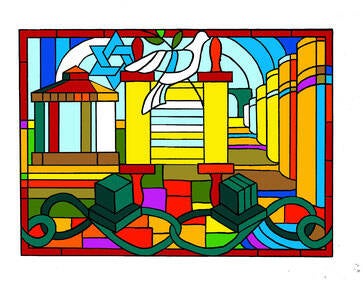 Diese Entwürfe des Nürnberger Künstlers Michael Jampolski waren ursprünglich gedacht als beleuchtete Glasfenster, als Teil einer Mauer aus Jerusalem-Stein für die sog. Kunstwand im neuen Gemeindesaal der Israelitischen Kultusgemeinde Nürnberg. Die letzten beiden Bilder ganz unten verschönern heute die Räume unseres Forums.